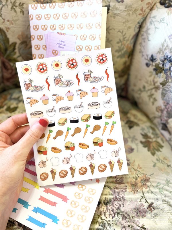 Per raccontarli usa la penna e, se vuoi, anche la tua creatività: puoi incollare scontrini e bigliettini, disegnare i piatti che ami, colorare le grafiche che ho creato per te, usare ritagli e sticker.