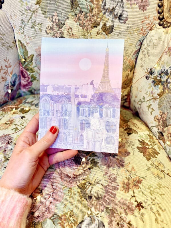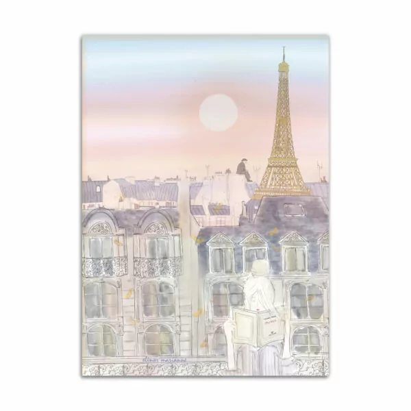 Una donna che legge nell’aria rosa della sera, tra i tetti blu di Parigi. La Tour Eiffel che brilla. Da qualche parte – molto più lontano della notte, molto in alto del giorno – un poeta che scrive d’amore.