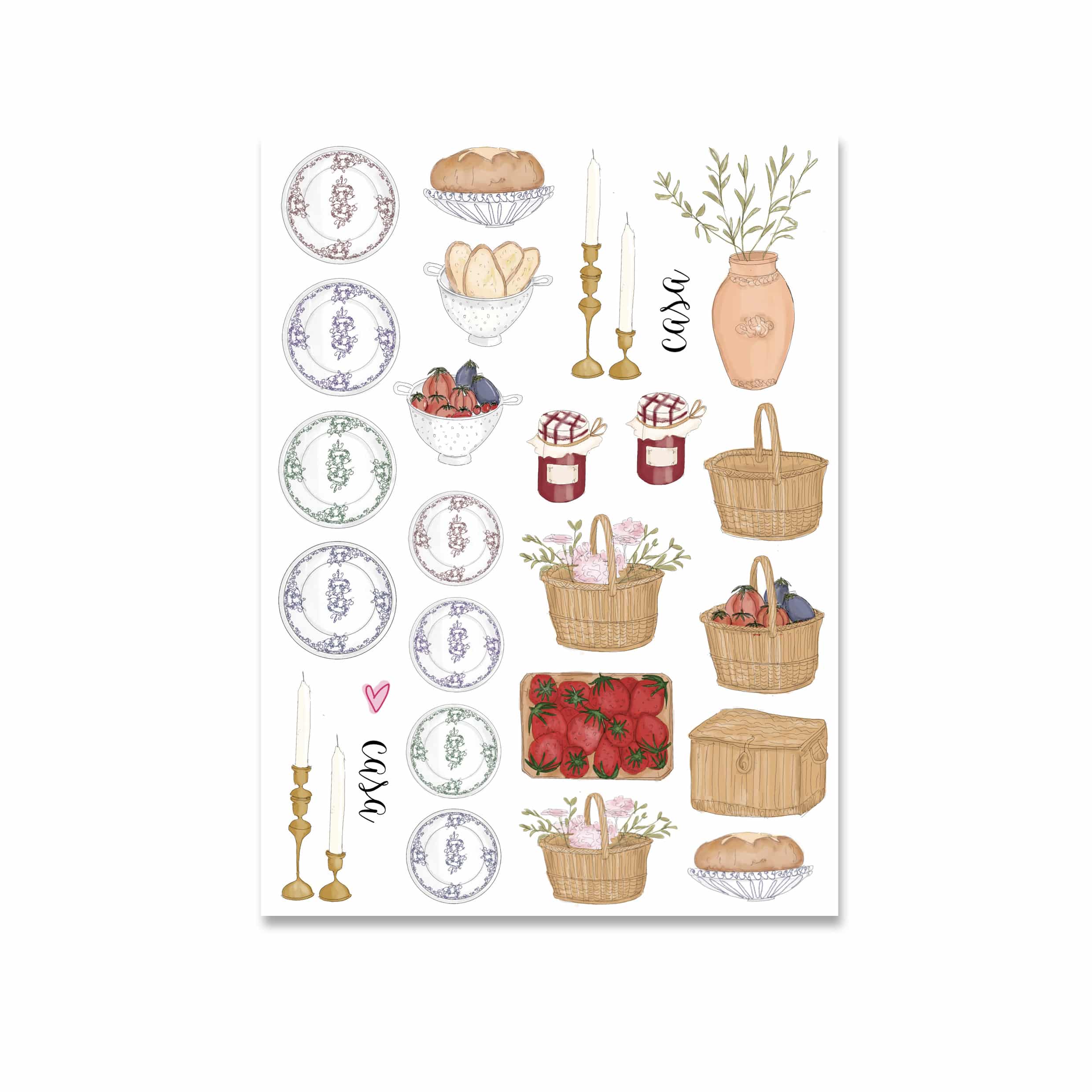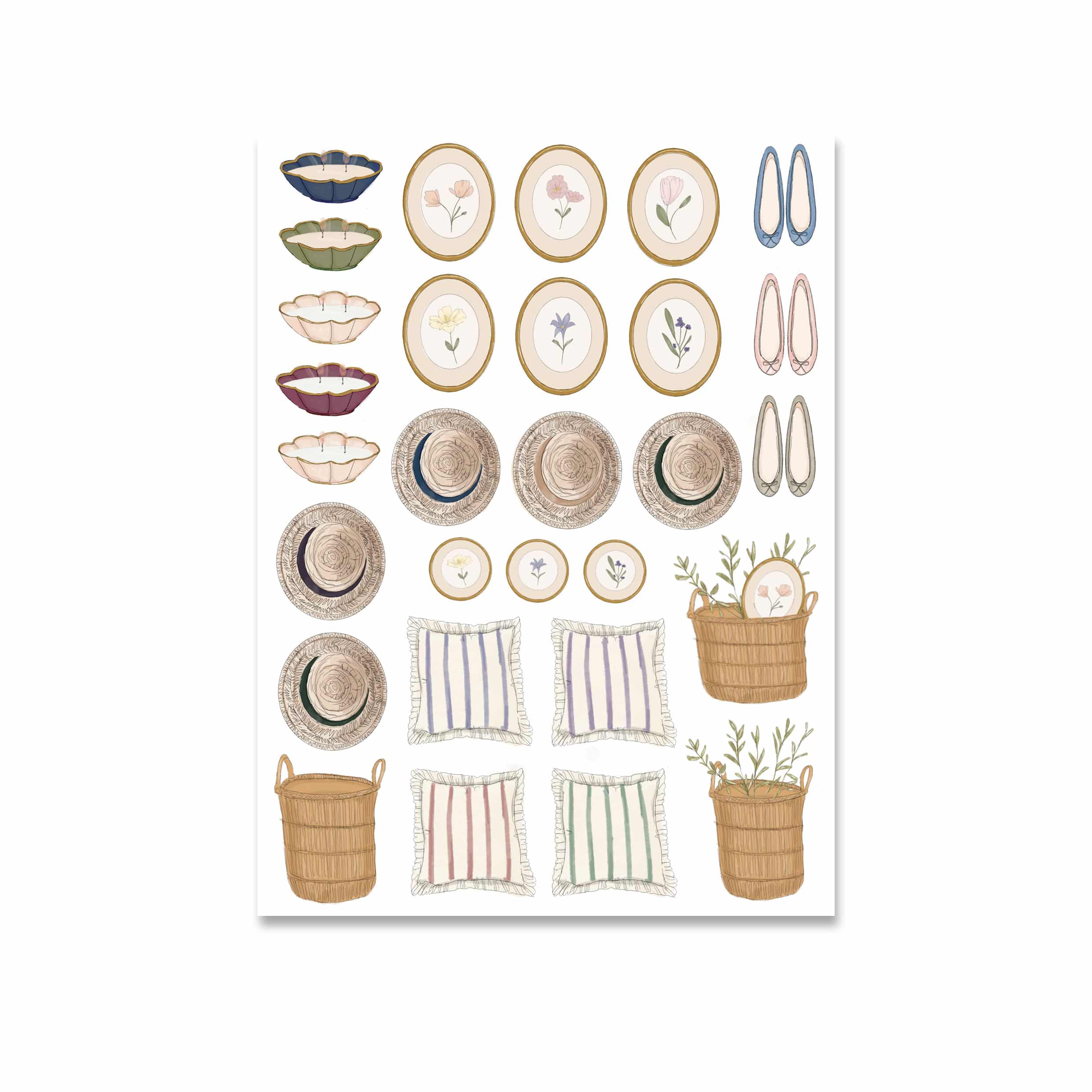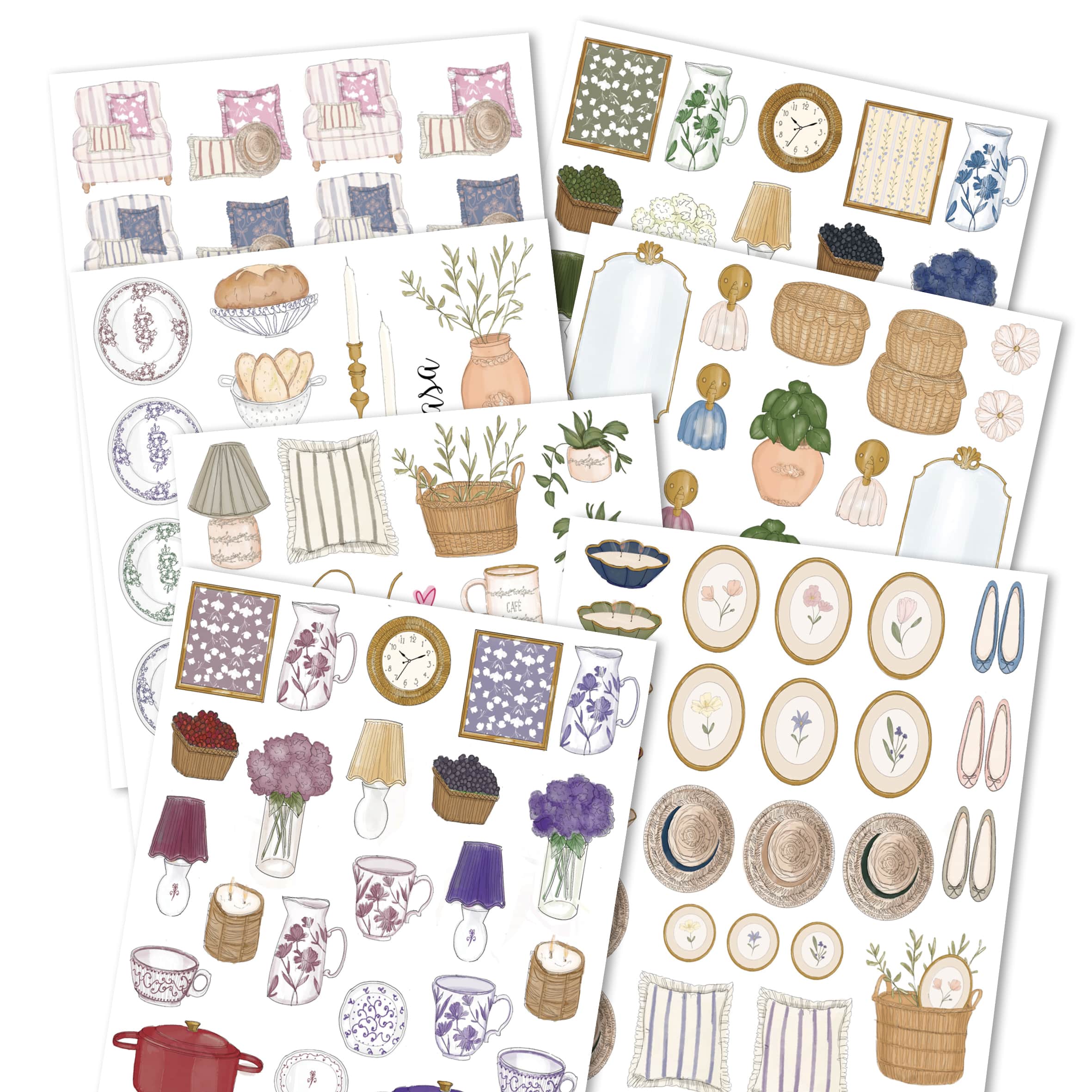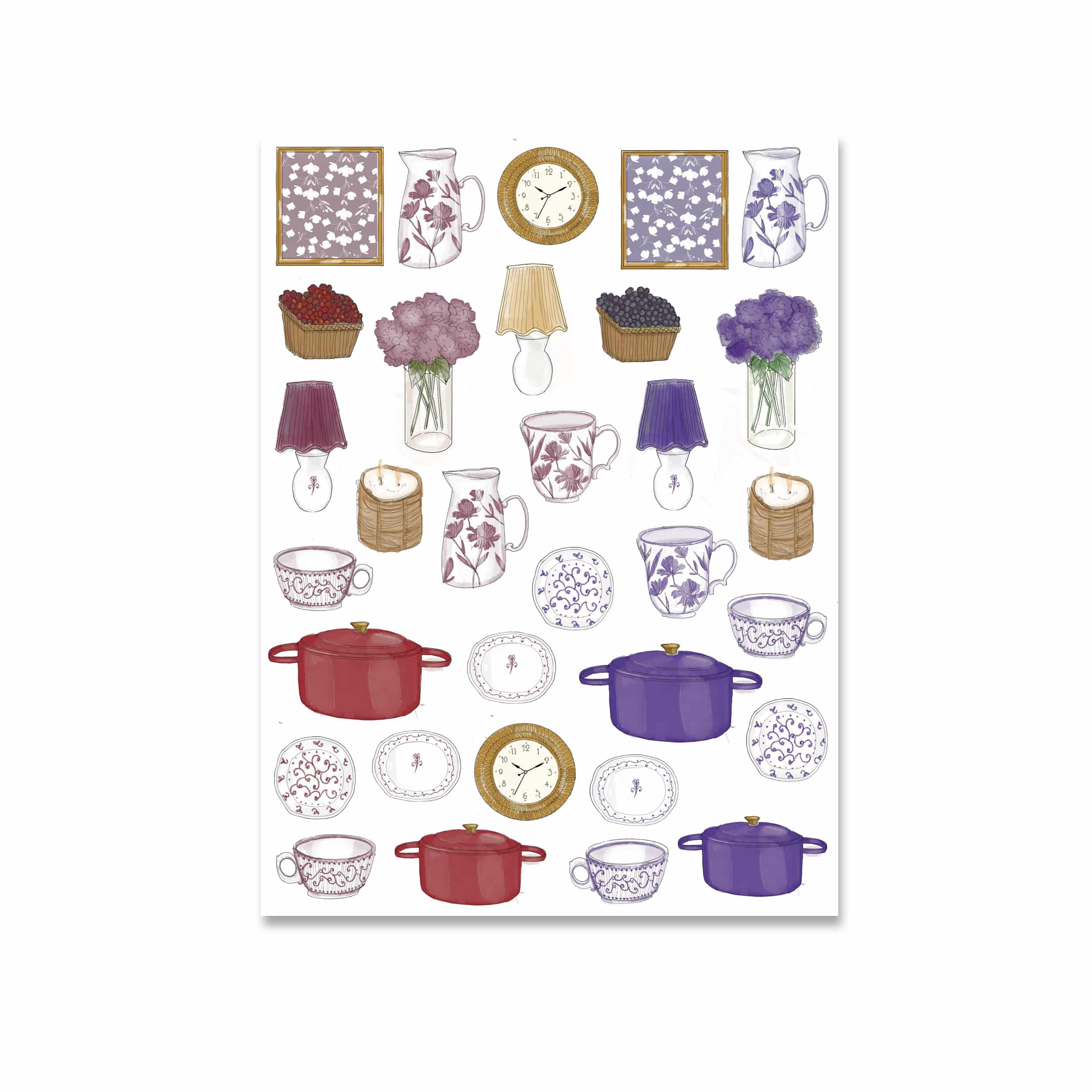 Sette fogli di sticker per sentirsi come in una casa in Provenza: un tripudio di porcellane, cornici, ceste di vimini, tegami, vasi di fiori, lampade, cuscini, divani, cappelli di paglia.