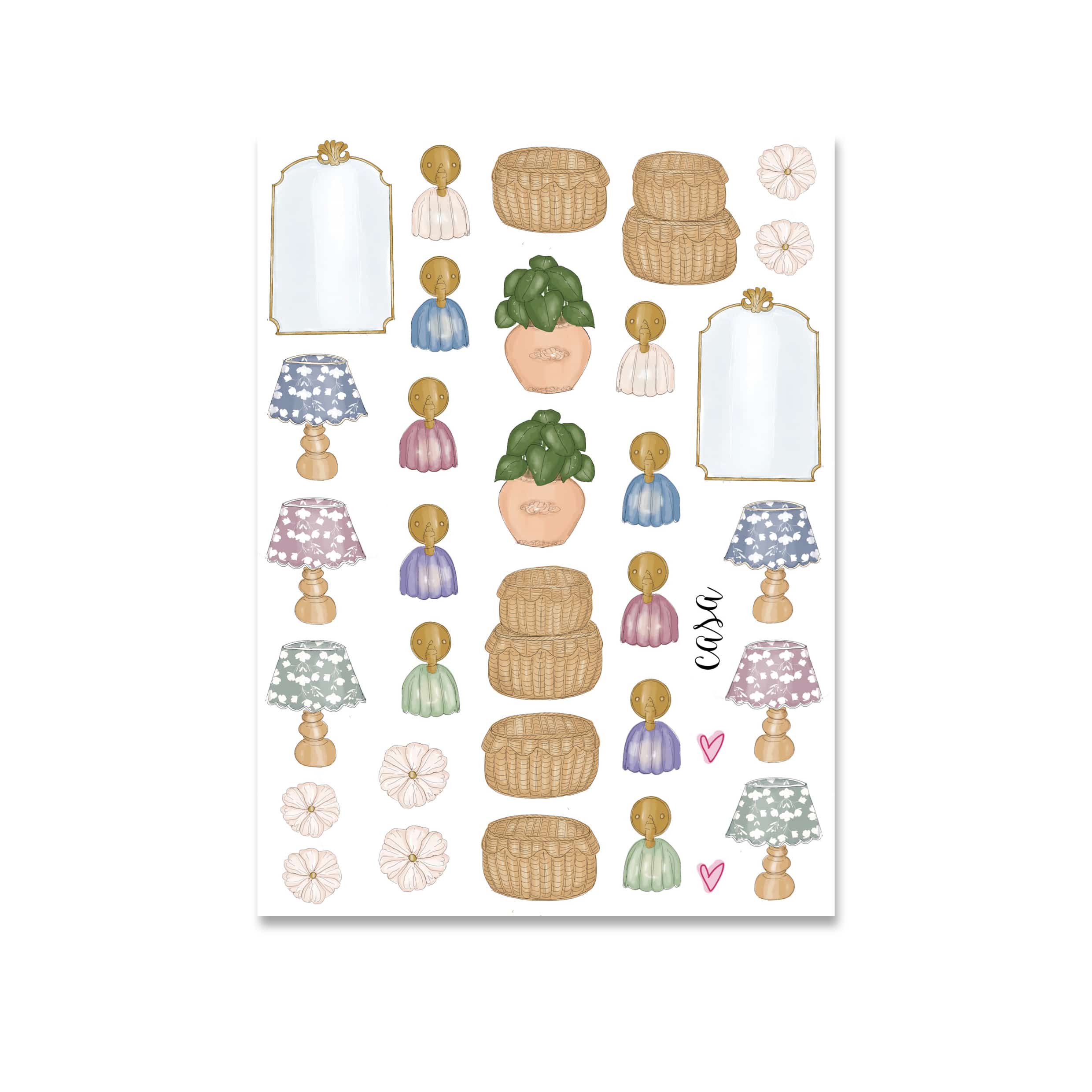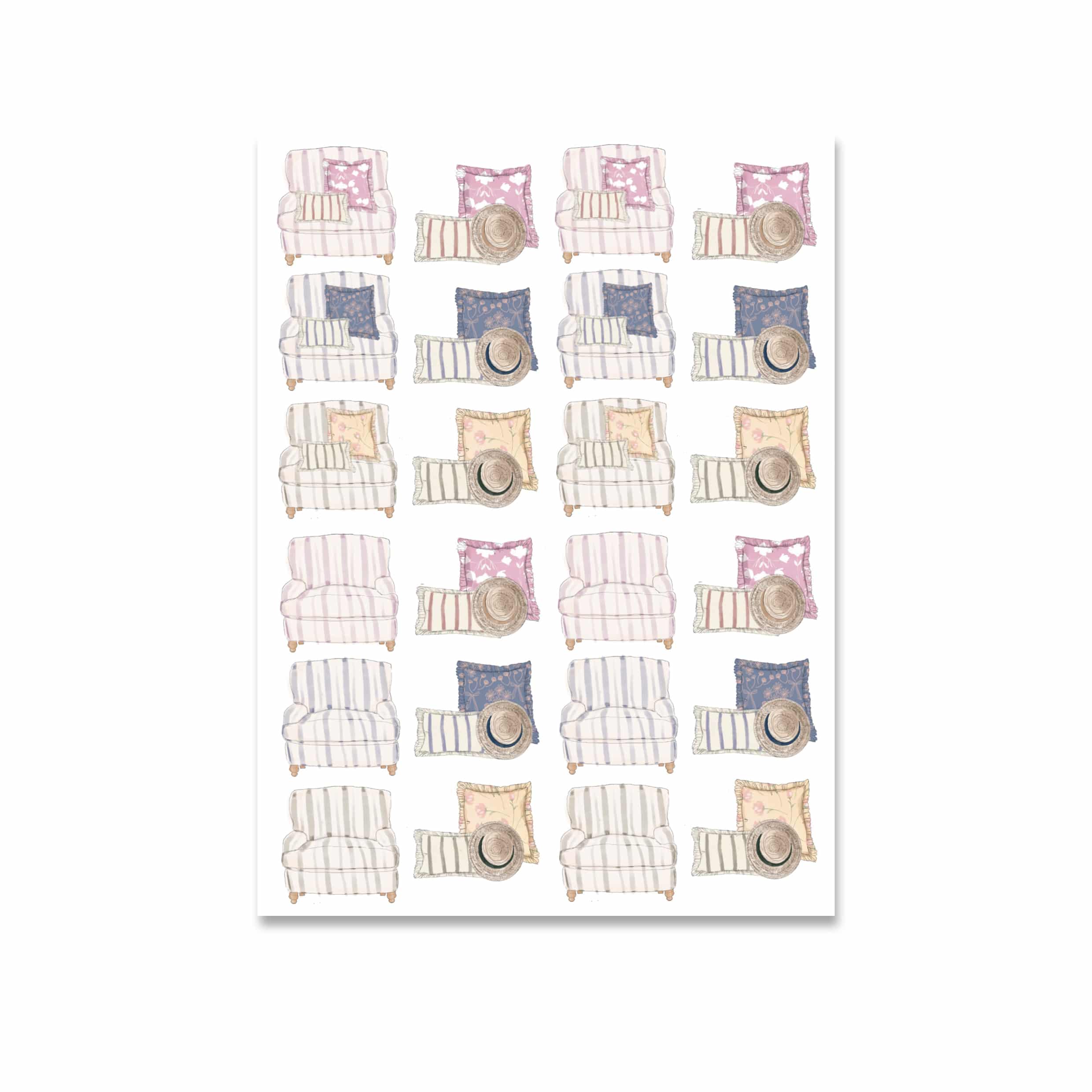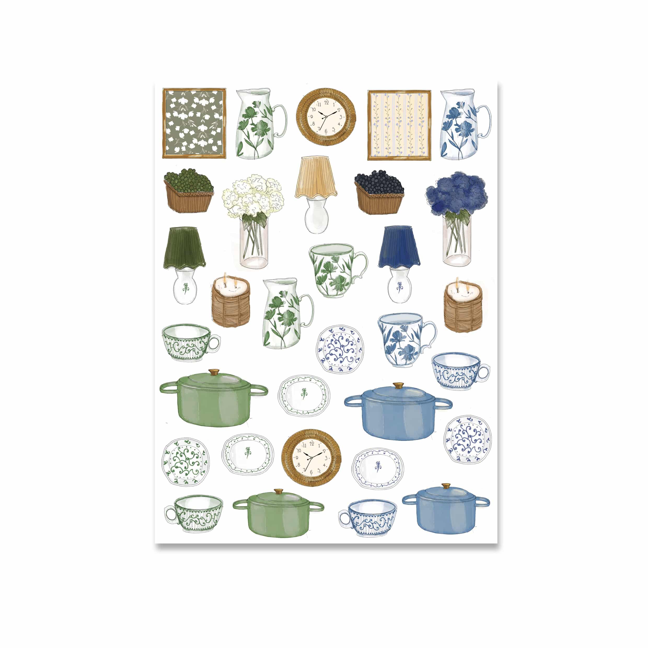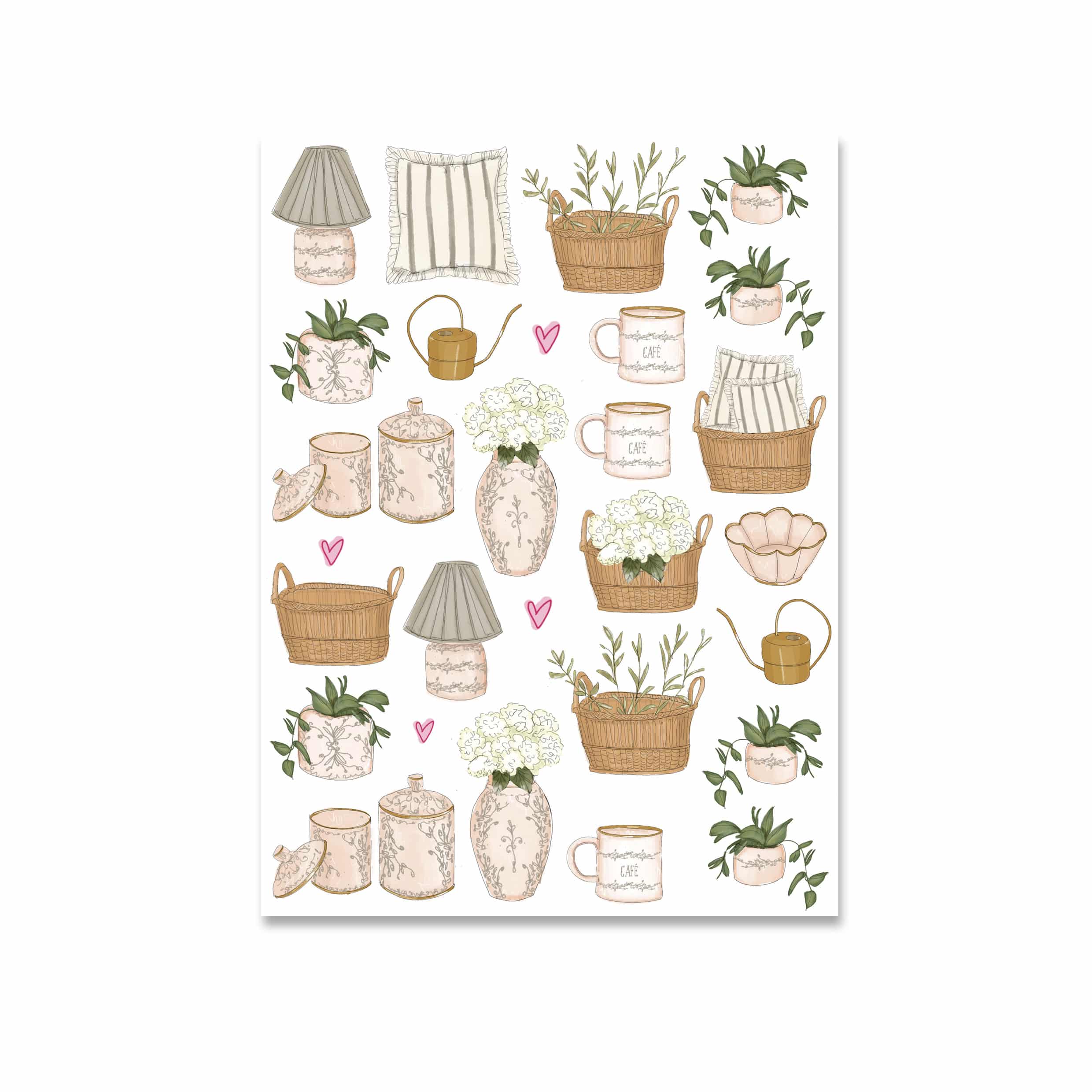 Sette fogli di sticker per sentirsi come in una casa in Provenza: un tripudio di porcellane, cornici, ceste di vimini, tegami, vasi di fiori, lampade, cuscini, divani, cappelli di paglia.