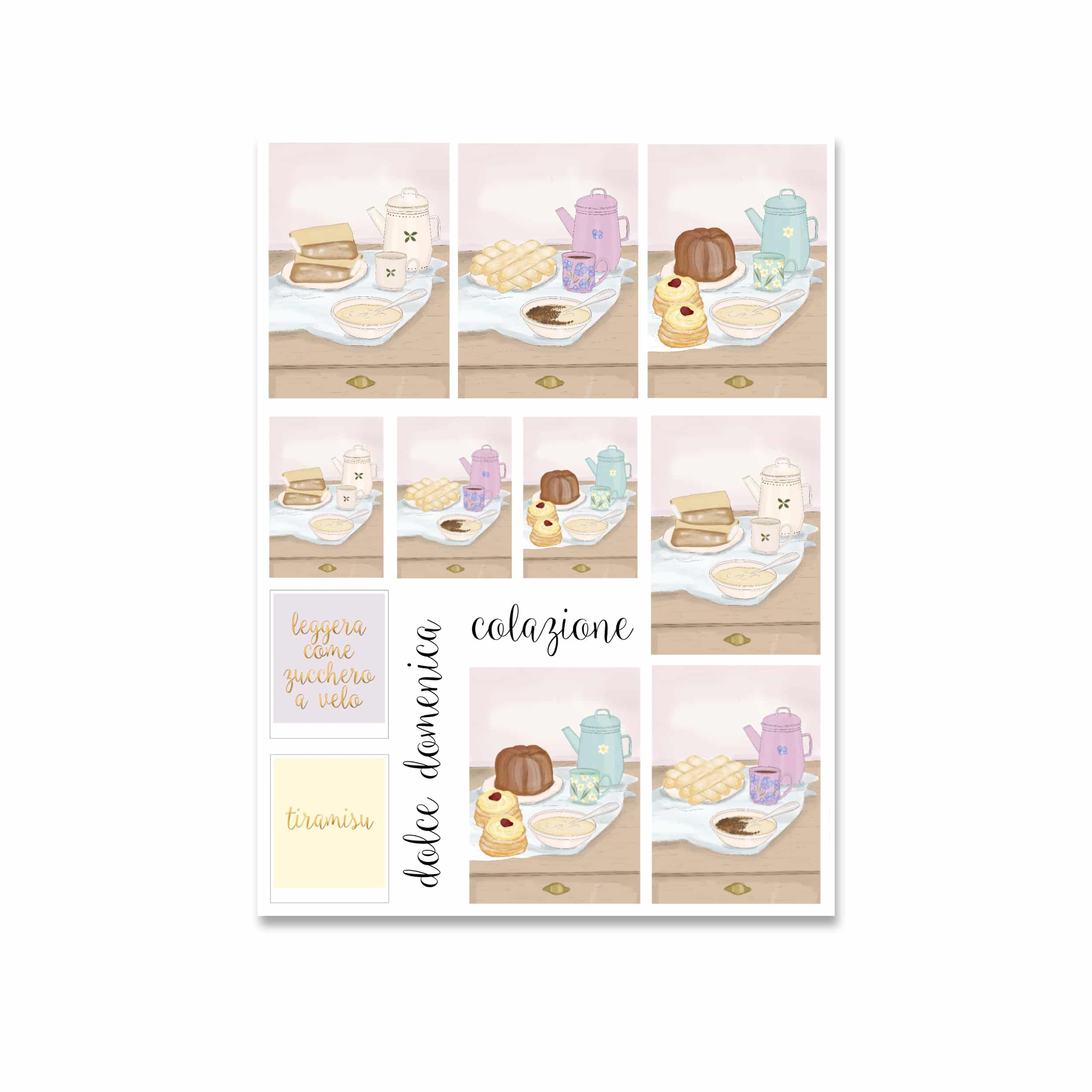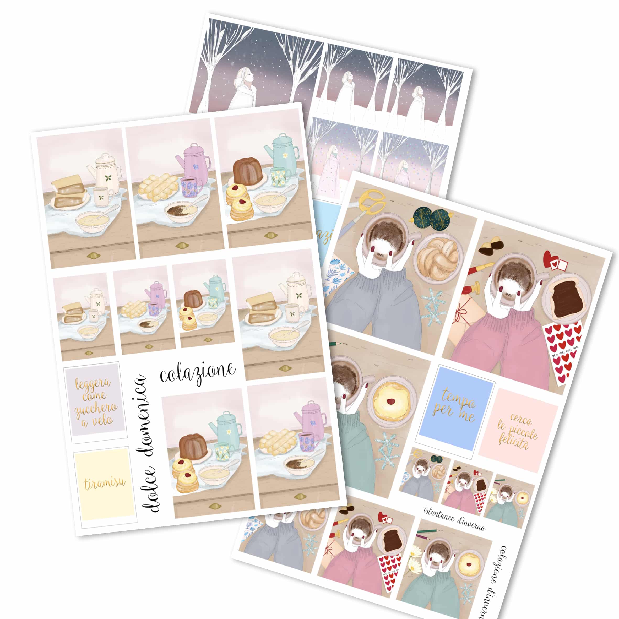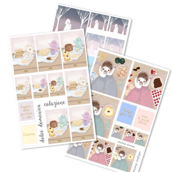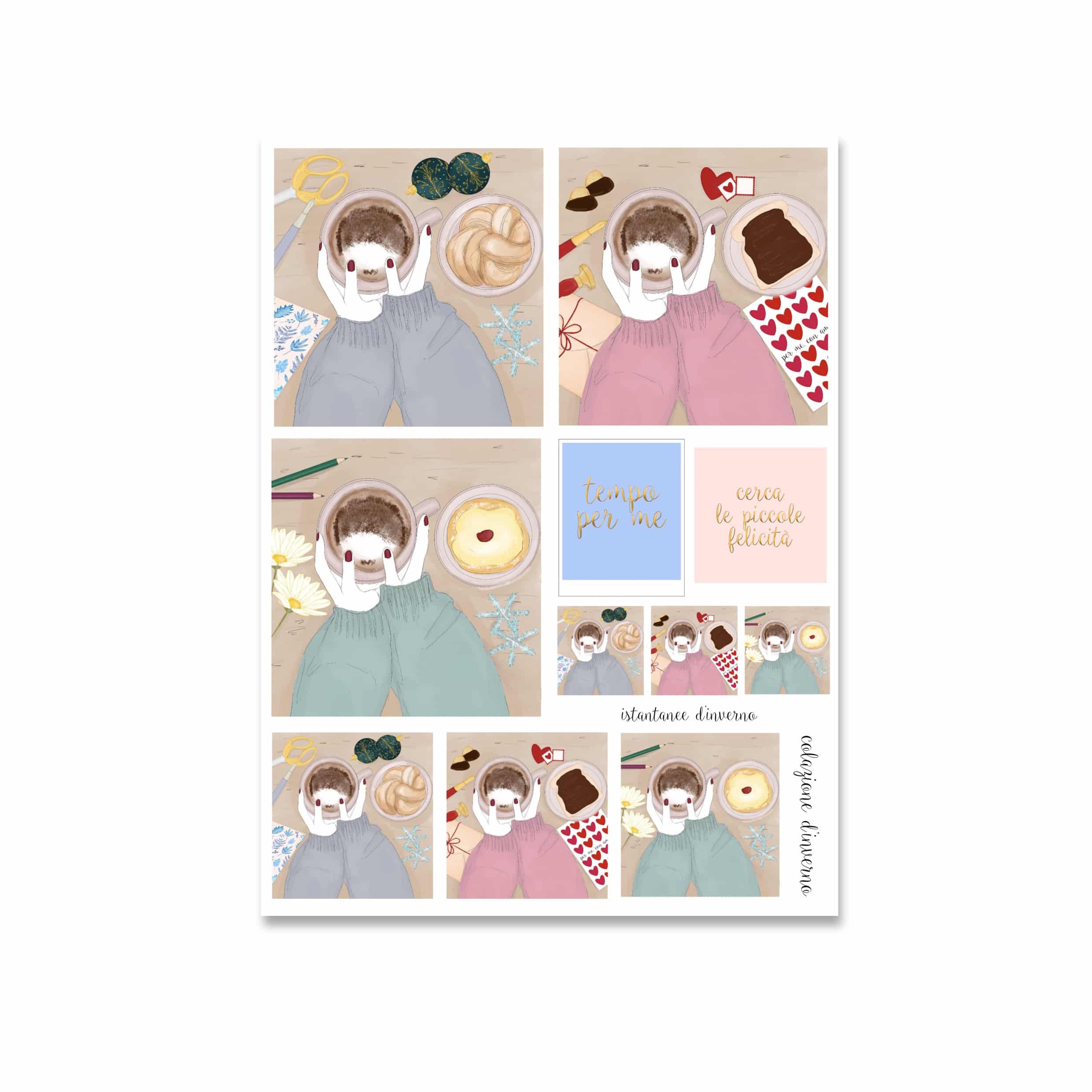 Tre fogli di sticker dedicati ai momenti più dolci dell’inverno, quelli con noi stesse: una tazza calda, un dolcino per merenda, gli sticker sul tavolo, le stagioni che scorrono e ci fanno sentire presenti, grate.