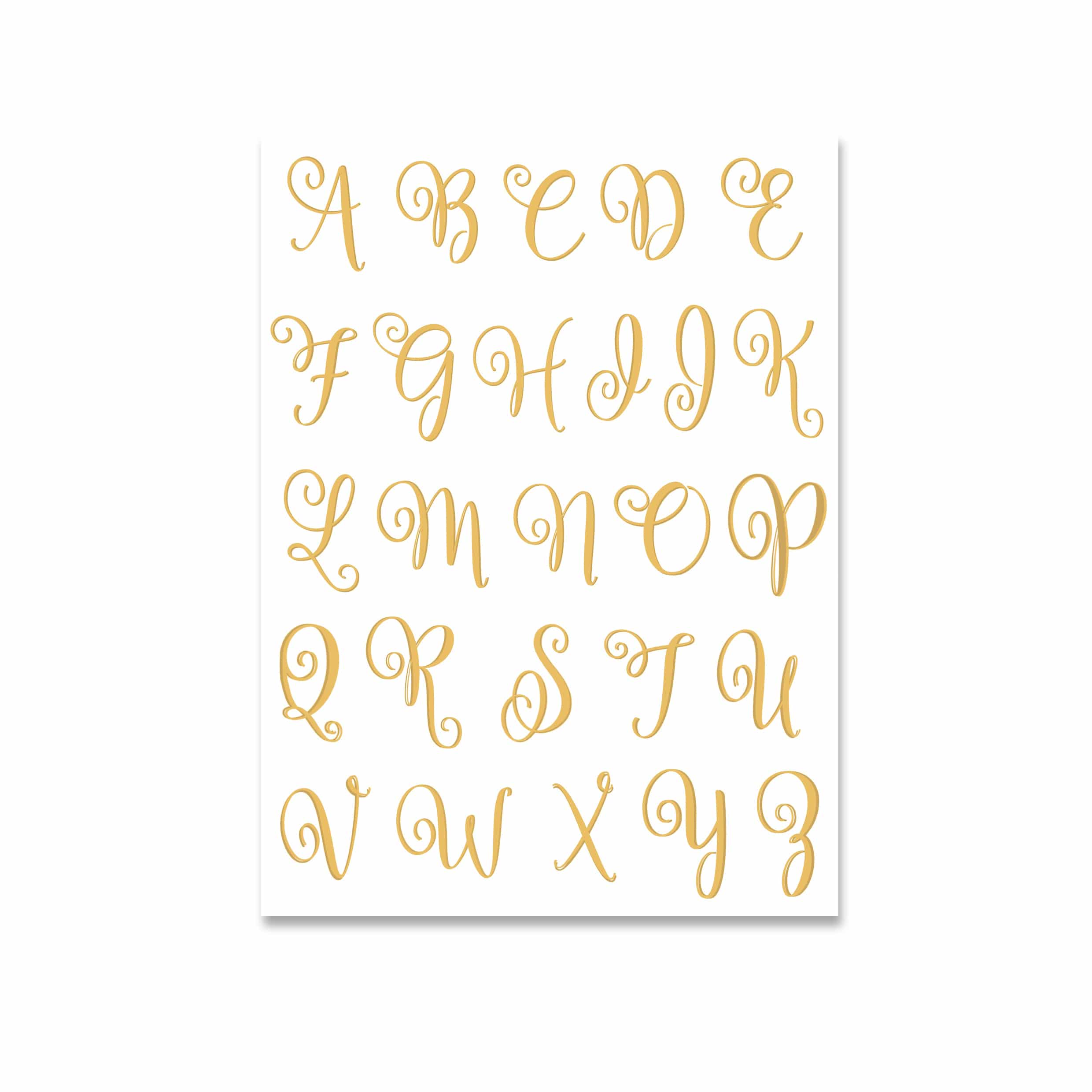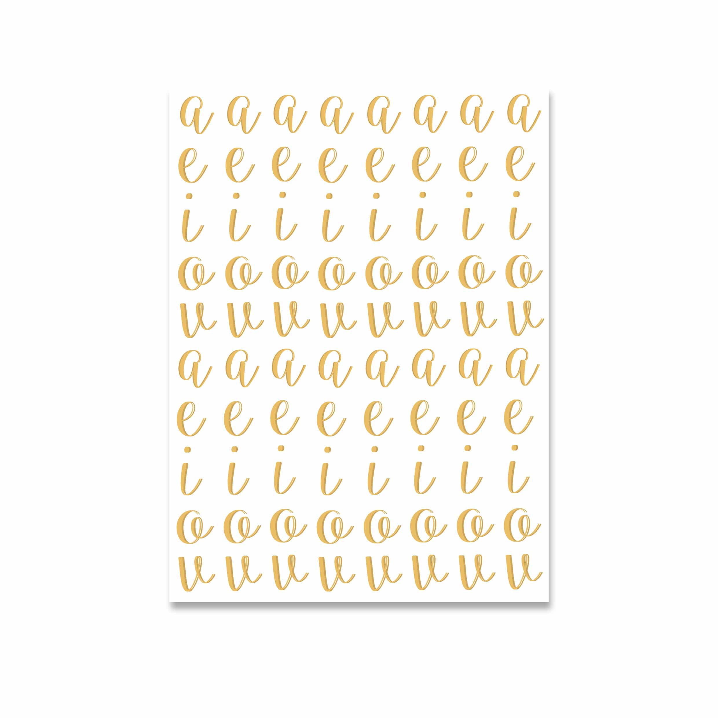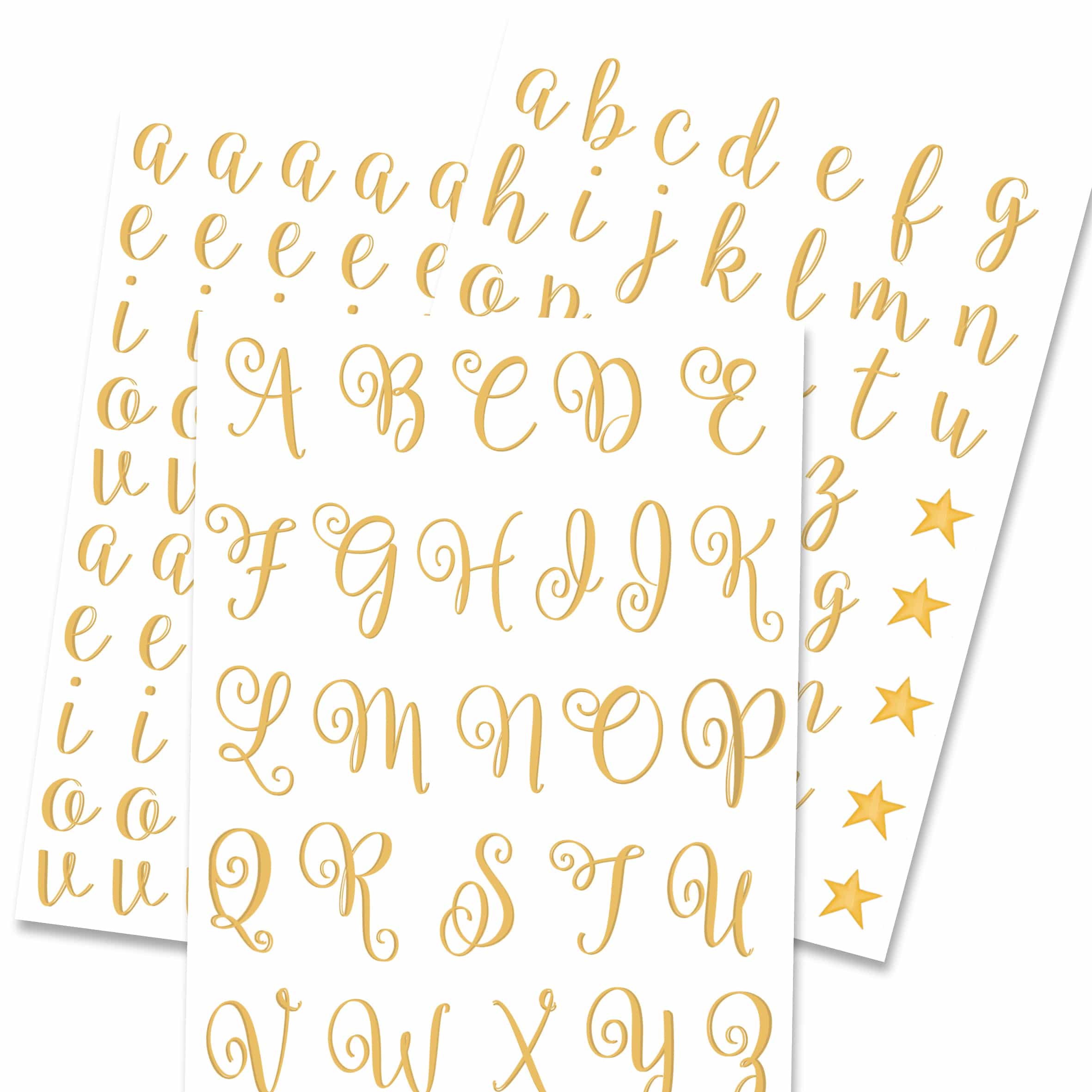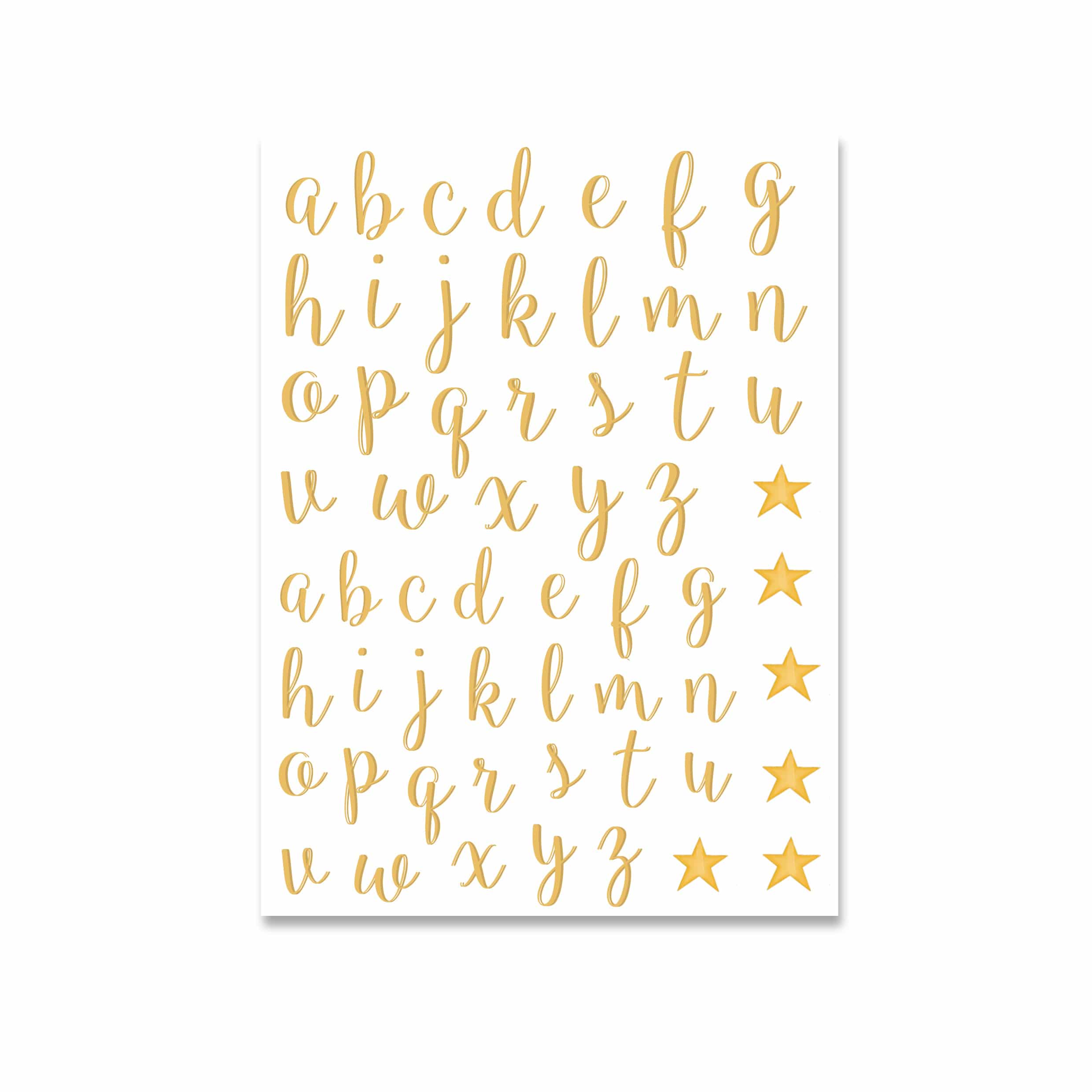 Tre fogli di sticker lettere dorate con carattere elegante e raffinato: maiuscole, minuscole e vocaboli (si sa che finiscono sempre per prime!).