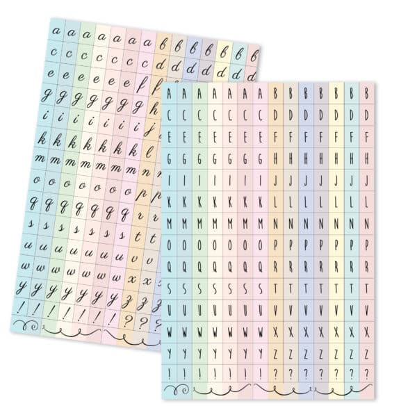 Quattro fogli (formato 14×19 cm) con tante lettere adesive nei toni fluo e pastello, con cui decorare le nostre agende e i nostri quaderni.