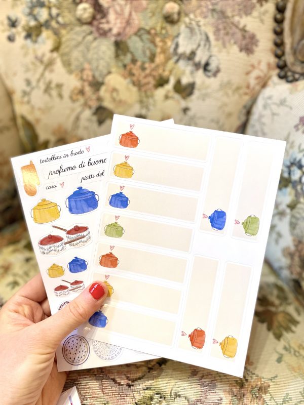 Due fogli di sticker per celebrare la magia della cucina: tegami ricolmi di ragù, piatti con i puntini bianchi, profumo di casa, di cucina, di domenica.